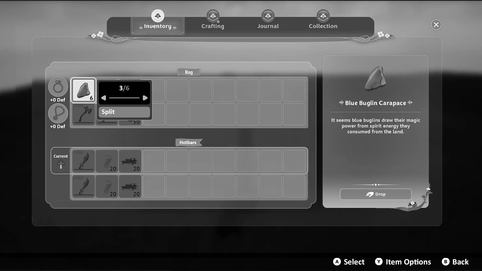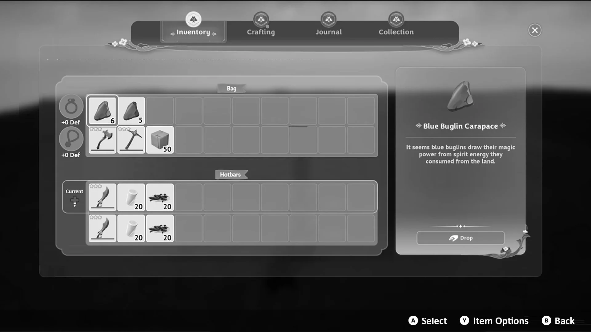 This was an early first pass on updating the player’s inventory UX. The player has a limited amount of slots in their bag (30 total) but a consistent ask from playtesters and developers was a way to allow a quick way to swap between different “hotbar” slots. I created a new UX that moved one row from their bag to a new row in the hotbar UX. Using the D-Pad, players could quickly swap from a custom hotbar that could hold either all their weapons, food, or crafting items.