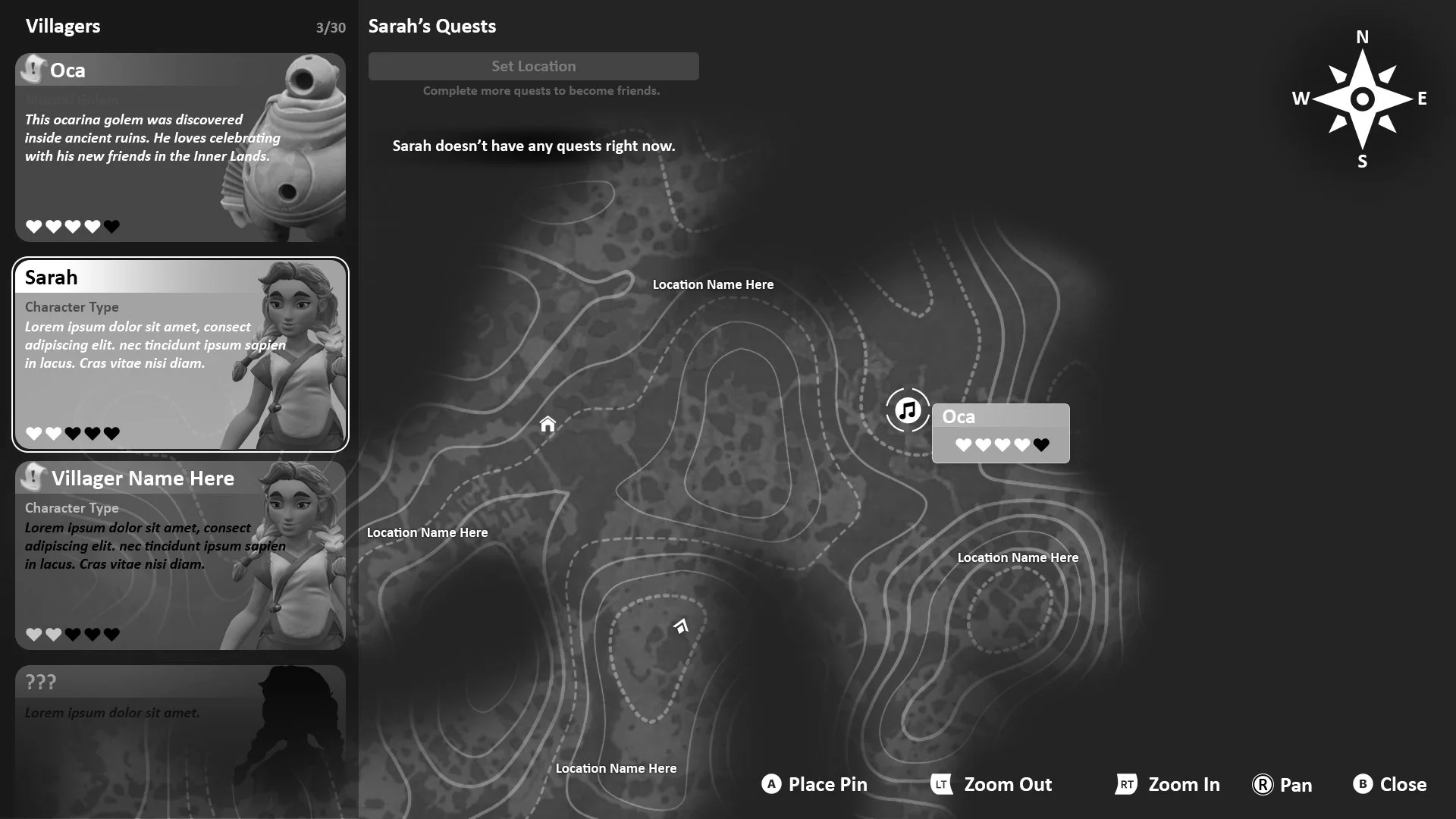 I tied the players Journal, which also contained NPC quests, to the map overview. Players could navigate the Hero list and associated quests as well as track the quests directly from this UI.