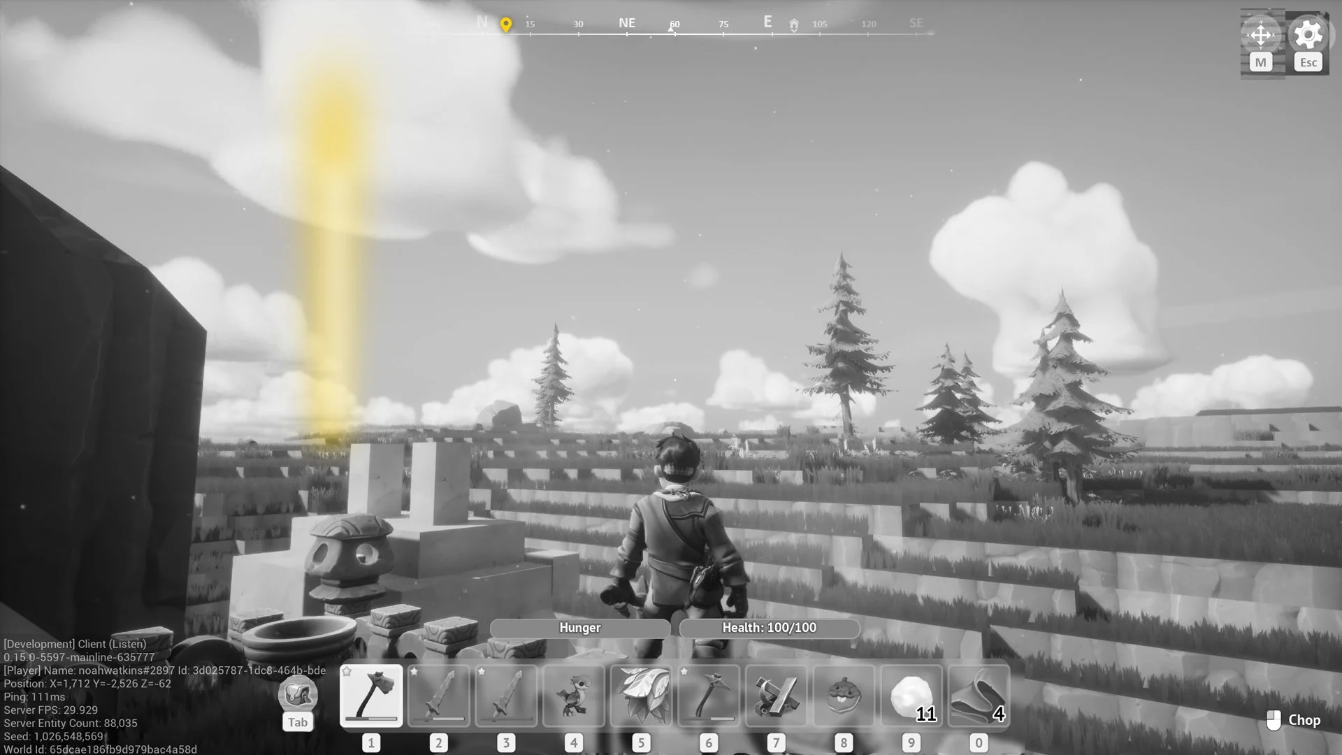 I added a compass at the top center for frame of reference. Previously, there was no compass or directional navigation. I added a compass on the HUD and POI icons that would allow for directional context. Pinning a location on the map would also add a “pillar of light” that helped world navigation. Other players would have an assigned color to their pillar of light if they also added a pinned location.