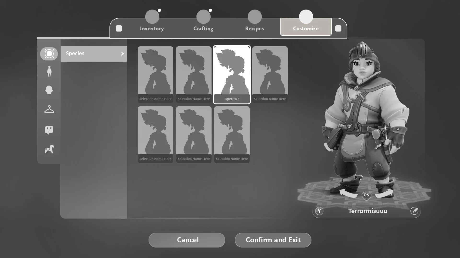 I designed the UX for the Character Customization. The goal for this feature is to have this UI accessible from the front end when the players were first starting a world as well as being available from their player UI at any time.