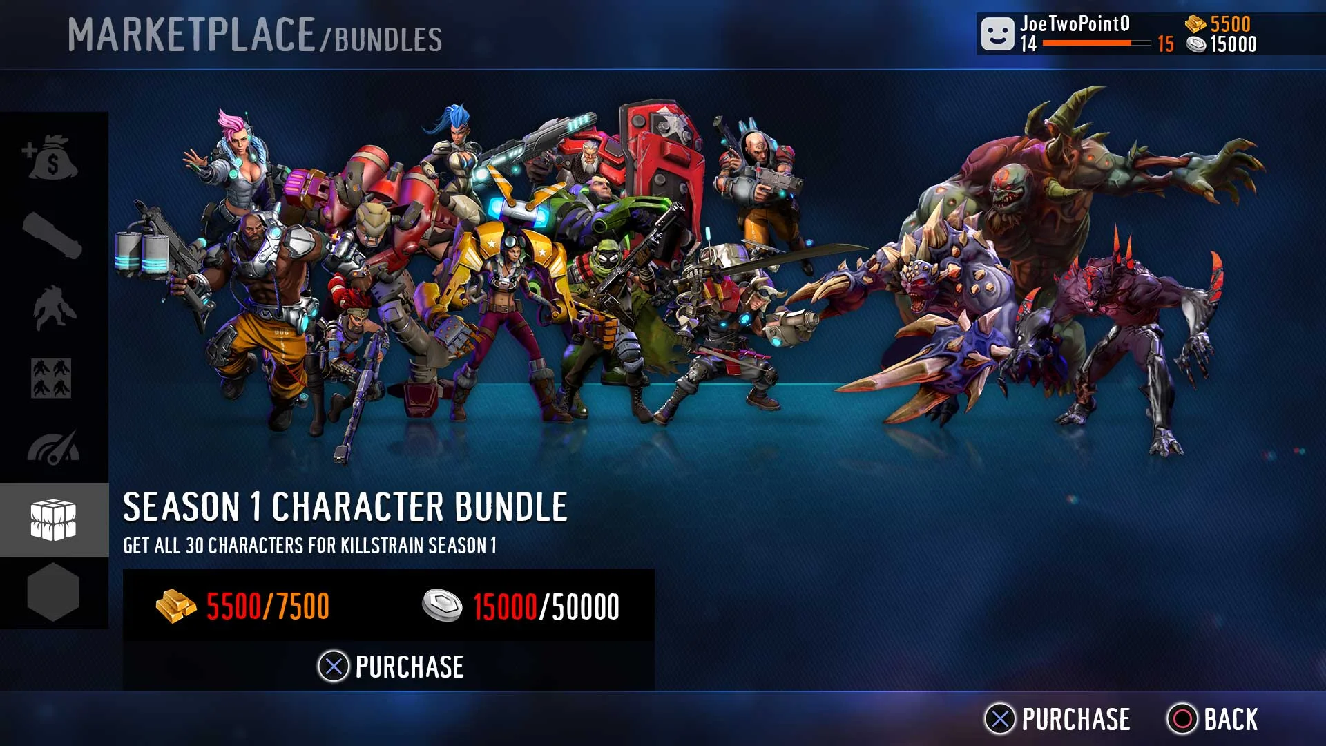 I was tasked with coming up with a new layout for the Marketplace and how to make the Upsell for the character bundle more interesting. I mocked this version up to reflect more of a "Versus" scene and laid out all the characters on one plane that looked like reflected glass. The Character bundles and in-game notifications now follow a similar style.